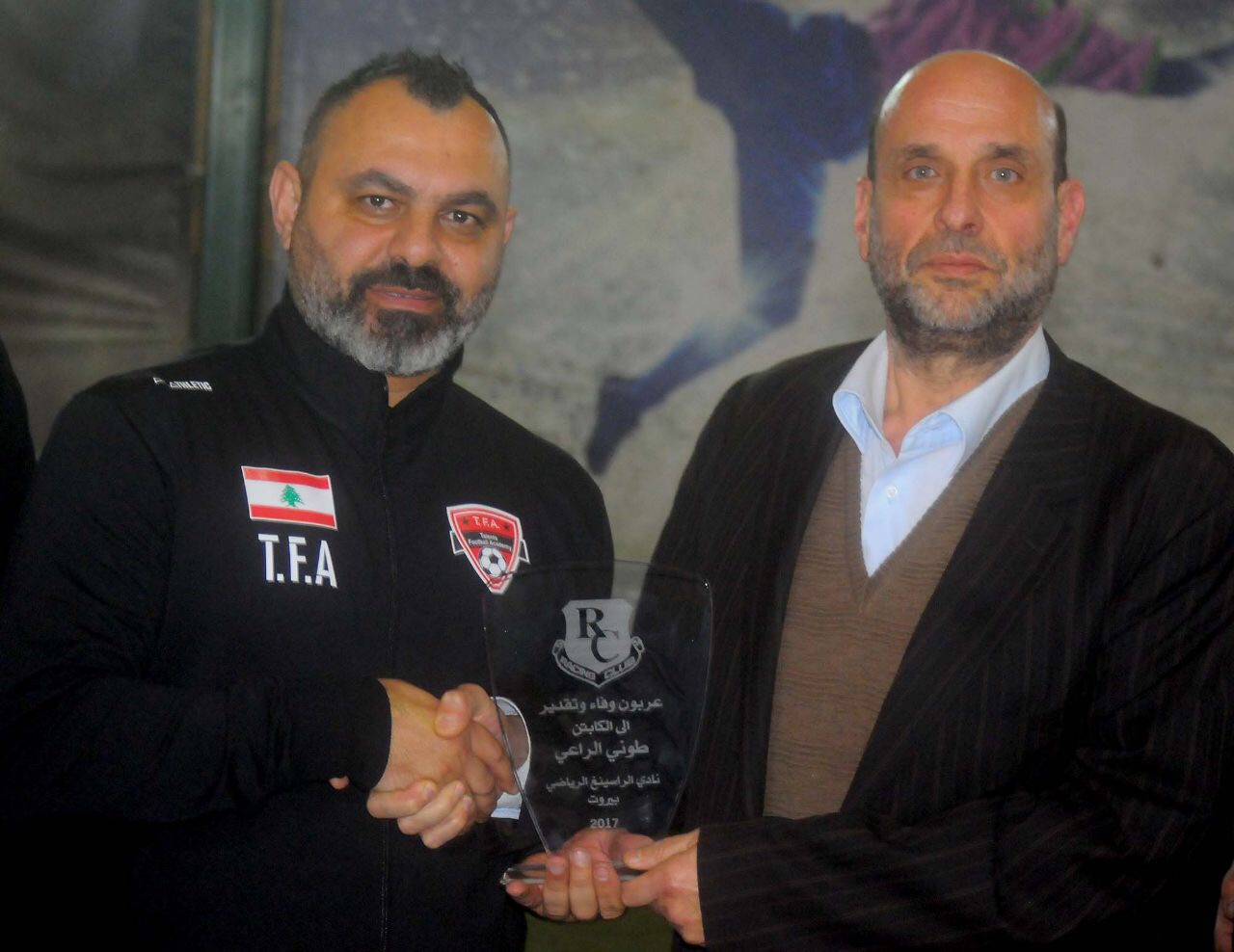 وكَلفتة ايجابية منه، قدّم الراعي درعاً تقديرية الى المدرب اسامة الصقر، في حين قامت ادارة نادي الراسينغ بيروت بتقديم درع تذكارية للراعي على عطاءاته اللامحدودة مع النادي.