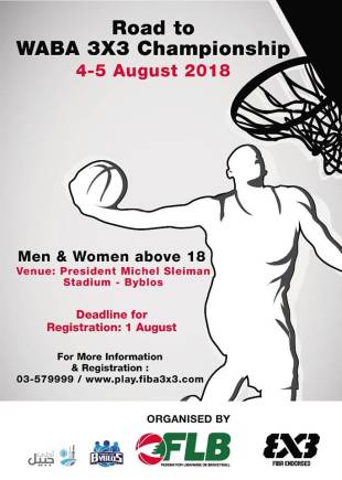 ينظم الاتحاد اللبناني لكرة السلة مسابقة في كرة السلة (3x3) في 4 و5 آب المقبل في "مجمّع الرئيس ميشال سليمان" في جبيل، لفئتي فوق ال18 سنة للرجال والسيدات.