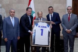 وسلّم الوفد الرئيس عون القميص الابيض الرقم 1 في النادي، عربون تقدير لدوره خصوصاً انه كان من مشجعي نادي الراسينغ في عز عطاءاته.
