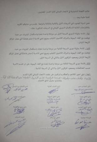 صدر عن اندية محافظة الجنوب في كرة القدم ما يأتي: " جانب اللجنة التنفيذية للاتحاد اللبناني لكرة القدم، نحن اندية منطقة الجنوب في الدرجات الاولى والثانية والثالثة والرابعة نتقدم من جانبكم بالمقترحات التالية لاستكمال الدوري اللبناني لهذه الدرجات: