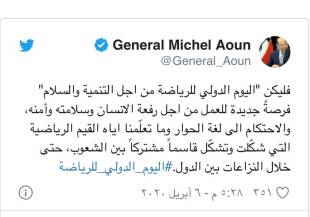 غرّد رئيس الجمهورية العماد ميشال عون عن اليوم الدولي للرياضة قائلا: "فليكن اليوم الدولي للرياضة من اجل التنمية والسلام، فرصةً جديدة للعمل من اجل رفعة الانسان وسلامته وأمنه، والاحتكام الى لغة الحوار وما تعلّمنا اياه القيم الرياضية التي شكّلت وتشكّل قاسماً مشتركاً بين الشعوب، حتى خلال النزاعات بين الدول.