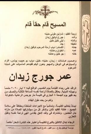 وإيمانا بتعاليم الكنيسة، وتماشيا مع الإجراءات المتخذة، وحفاظاً على سلامة الجميع، تثمن عائلة الفقيد وتشكر كل من سيشاركها الصلاة من منزله بدل الحضور، وتشارك في وقت لاحق بقداس الهي لراحة نفسه، وتقبّل التعازي.