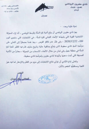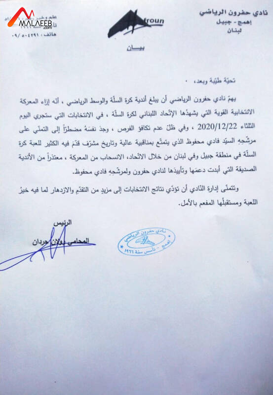 يهم نادي حفرون  الرياضي ان يبلغ اندية كرة السلة والوسط الرياضي انه ازاء المعركة الانتخابية القوية التي يشهدها الاتحاد اللبناني لكرة السلة في الانتخابات التي ستجري اليوم الثلاثاء 22 كانون الأول 2020، وفي ظل عدم تكافوء الفرص، وجد نفسه مضطراً الى التمني على مرشحه السيد فادي محفوظ الذي يتمتّع بمناقبية عالية وتاريخ مشرّف قدّم فيه الكثير للعبة كرة السلة في منطقة جبيل وفي لبنان من خلال الاتحاد، الانسحاب من المعركة معتذراً من الأندية الصديقة التي أبدت دعمها وتأييدها لنادي حفرون ولمرشحه فادي محفوظ.