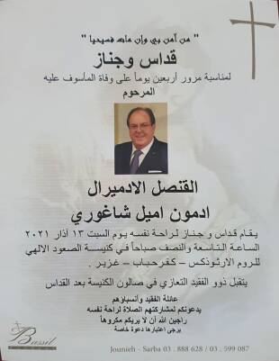 دعت عائلة وأنسباء الراحل القنصل الفخري لسفارة الاوروغواي في لبنان ورئيس الاتحاد اللبناني للمحركات المائية والرئيس الفخري للاتحاد اللبناني لليخوت الأدميرال ادمون اميل شاغوري إلى مشاركتها الصلاة لمناسبة مرور 40 يوما على وفاته، وذلك عند الساعة 9.30 من صباح السبت 13 أذار الجاري 2021 في كنيسة الصعود الالهي للروم الأورثوذكس في كفرحباب غزير .