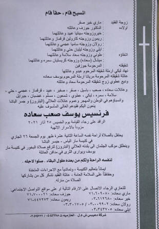 يُحتفل بالصلاة لراحة نفسه عند الساعة 12.00 من ظهر الجمعة 26 آذار الجاري في كنيسة مار الياس (جسر الباشا)، ثم ينطلق موكب الجثمان الى بلدته العلالي (قضاء البترون) لترفع صلاة البخور في كنيسة مار يوسف ويوارى الثرى في مدافن العائلة.
