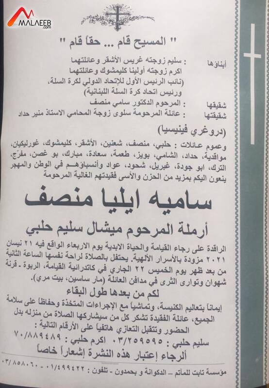 غيّب الموت الراحلة سامية ايليا منصف والدة نائب رئيس الاتحاد الآسيوي ورئيس الاتحاد اللبناني لكرة السلة أكرم حلبي وأرملة المرحوم ميشال سليم حلبي.