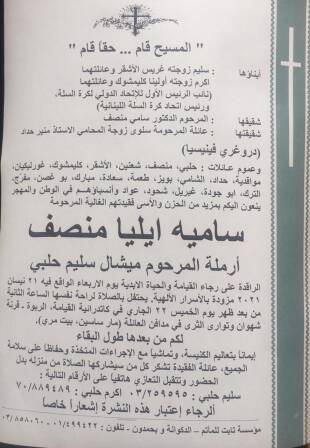 يحتفل بالصلاة لراحة نفسها عند الساعة 14.00 من بعد ظهر الخميس 22 نيسان الجاري في "كاتدرائية القيامة" - الربوة- قرنة شهوان وتوارى الثرى في مدافن العائلة (مار ساسين-بيت مري). وتماشياً مع الاجراءات المتخذة وحفاظاً على سلامة الجميع تشكر عائلة الفقيدة كل من سيشاركها الصلاة من منزله بدل الحضور وتتقبّل التعازي هاتفياً: سليم حلبي  259595-03 وأكرم حلبي 889489-70.