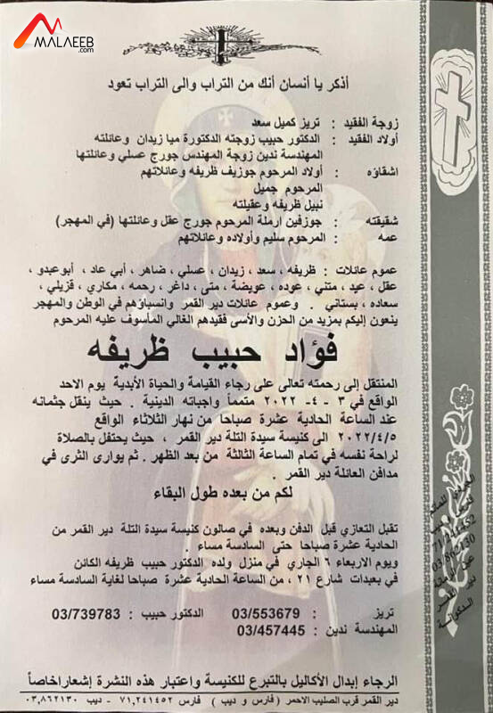 تُقبل التعازي قبل الدفن وبعده في صالون كنيسة سيدة التلة (دير القمر) من الساعة 11.00 قبل الظهر حتى الساعة 18.00 مساء، ويوم الأربعاء 6 نيسان الجاري في منزل الدكتور حبيب ظريفة الكائن في بعبدات - شارع 21 من الساعة 11.00 قبل الظهر حتى الساعة 18.00 مساءً.