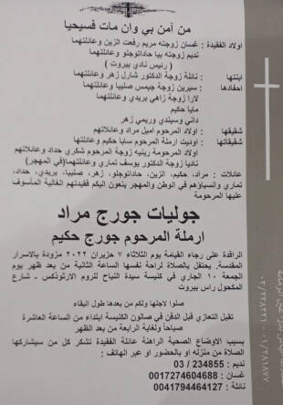 يُحتفل بالصلاة لراحة نفسها عند الساعة 14.00 من بعد ظهر الجمعة 10 حزيران الجاري في كنيسة سيدة النياح للروم الأرثوذكس (شارع المكحول - رأس بيروت).