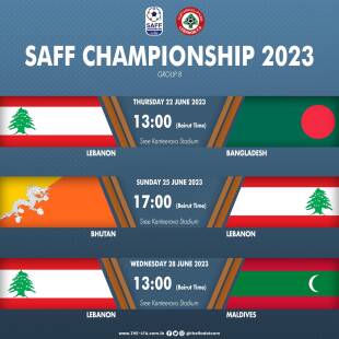 ويلعب لبنان مباراته الاولى الخميس 22 حزيران ضد بنغلادش عند الساعة 13.00 بعد الظهر بتوقيت بيروت، ويواجه بوتان السبت 25 حزيران الجاري عند الساعة 17.00 بتوقيت بيروت، ويختم مبارياته في الدور الاول امام المالديف الاربعاء 28 حزيران عند الساعة 13.00 بعد الظهر.