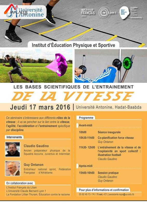 ينظّم معهد التربية البدنية والرياضية في الجامعة الأنطونيّة، بالتعاون مع المركز الفرنسي في لبنان وجامعة كلود برنارد (ليون 1 الفرنسية) ومؤسسة ليليان تورام، مؤتمراً تحت عنوان "الأسس العلميّة لتدريبات السرعة".