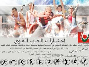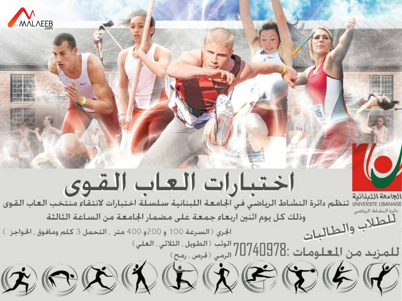 تنظّم دائرة النشاط الرياضي في الجامعة اللبنانية سلسلة إختبارات لإنتقاء منتخب ألعاب القوى، بدءاً من الثالثة من بعد ظهر أيام الإثنين والأربعاء والجمعة من كل أسبوع، على مضمار المجمّع الرياضي في مدينة الرئيس رفيق الحريري الجامعية – الحدث.