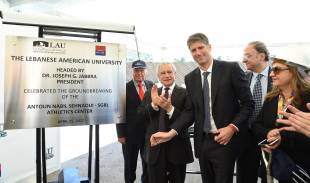 وُضع حجر الأساس لـ "مجمّع أنطون نبيل صحناوي – SGBL الرياضي" في حرم الجامعة اللبنانية الأميركية (LAU) في جبيل في احتفال حاشد، بحضور فاعليات سياسية واقتصادية وعسكرية وأمنية وتربوية،ورياضية وإعلامية، إضافة إلى إدارة الجامعة والهيئة التعليمية تقدّمها رئيس الجامعة الدكتور جوزف جبرا ورئيس مجلس إدارة بنك سوسييته جنرال في لبنان (SGBL) أنطون صحناوي، ورئيس مجلس النواب نبيه بري ممثلًا بالنائب أنطوان زهرا ورئيس مجلس الوزراء سعد الحريري ممثلًا بالنائب زياد القادري والنائب نائلة معوض وقائد الجيش العماد جوزيف عون ممثلًا بالعميد الركن عواد نجم والمدير العام للأمن العام اللواء عباس ابراهيم ممثلًا بالرائد البحري مازن صقر والمدير العام لقوى الأمن الداخلي اللواء عماد عثمان ممثلًا بالعميد اللواء رولان ضو والمدير العام لأمن الدولة اللواء طوني صليبا ممثلًا بالرائد ربيع الياس وقائمقام جبيل نجوى سويدان والمدير العام المنتدب لبنك سوسييته جنرال في لبنان السيّد فيليب دوبوا ونائب المدير العام للمصرف جورج صغبيني ورؤساء بلديات المنطقة ورئيس الجامعة السابق رياض نصار.