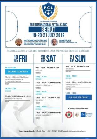 ينظم المدرب الوطني طارق رزق النسخة الثالثة من دورة المدربين الدولية في الفوتسال " Futsal Clinic Lebanon " (ذكورا واناثا) في 19 و20 و21 تموز المقبل، بالتعاون مع جامعة الروح القدس (الكسليك) وتحت اشراف الاتحاد اللبناني لكرة القدم.