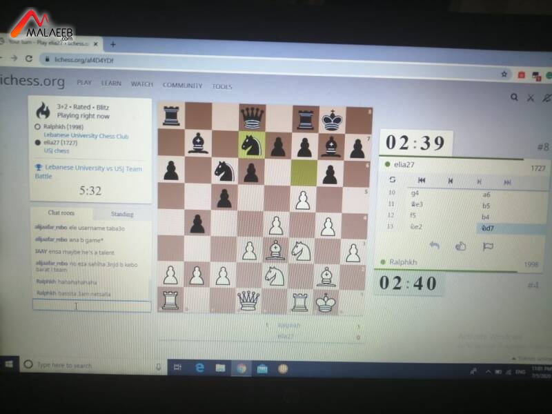 حقق فريق الشطرنج في الجامعة اللبنانية فوزاً صريحاً على نظيره في جامعة القديس يوسف (اليسوعية) بلغت نتيجته 164-21، في اللقاء الودي الذي نظّم عن بُعد بواسطة تقنية "زوم"، وأجري بطريقة الدوري من دور واحد، بإشراف مسؤول اللعبة والنشاط الرياضي في الفروع الثانية الياس خيرالله. واستغرقت كل جولة 3 دقائق اضافة الى ثانيتين لكل نقلة.