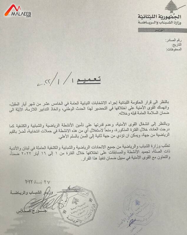 تطلب وزارة الشباب والرياضة من جميع الاتحادات الرياضية والشبابية والكشفية العاملة في لبنان والأندية ذات الصلة، تجميد الأنشطة والمسابقات على اختلافها خلال الفترة من 1 الى 16 ايار 2022 ضمناً، والتعاون مع القوى الأمنية في سبيل ضمان تنفيذ هذا القرار".