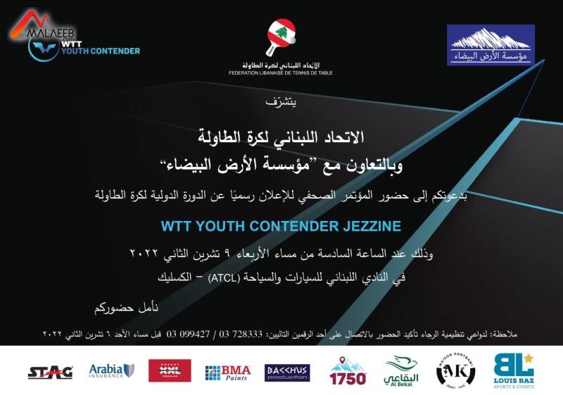 دعا الاتحاد اللبناني لكرة الطاولة و"مؤسسة الأرض البيضاء" رجال الصحافة والاعلام الى حضور المؤتمر الصحافي للاعلان رسمياً عن الدورة الدولية في كرة الطاولة"WTT Youth Contender Jezzine"  وذلك عند الساعة 18.00 من مساء الأربعاء المقبل الواقع في 9 تشرين الثاني الجاري في النادي اللبناني للسيارات والسياحة في الكسليك.