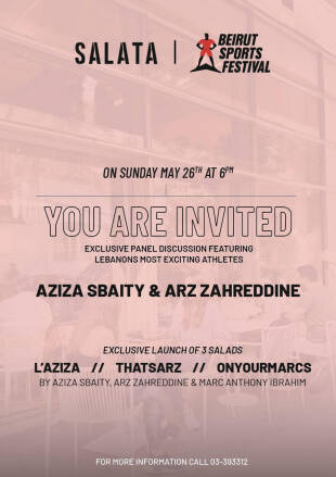 دعا مطعم" SALATA" رجال وسيدات الصحافة والاعلام الى الحضور والمشاركة في اللقاء الحواري الذي سيُعقد مع سفيرته العداءة الدولية البطلة عزيزة سبيتي وسفيره العداء البطل أرز زهر الدين حول تجربتهما مع "ملكة الألعاب" ألعاب القوى وذلك عند الساعة 18.00 من مساء الأحد الواقع فيه 26 أيار الجاري في جناح المطعم الكائن ضمن "مهرجان بيروت الرياضي" في "فوروم دو بيروت".
