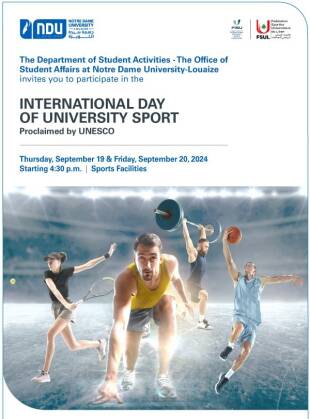 تنظّم دائرة الرياضة في جامعة سيدة اللويزة،لمناسبة اليوم العالمي للرياضة الجامعية المقرر سنوياً من قبل "الأونيسكو"، لقاءاً رياضياً جامعياً يومي الخميس 19 والجمعة 20 أيلول الجاري يتضمن الألعاب التالية: ستريت بول وتنس ولياقة بدنية.