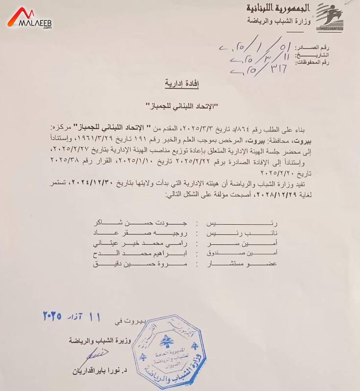 وبموجب هذه الإفادة، تؤكد وزارة الشباب والرياضة أن الولاية الحالية للهيئة الإدارية، التي بدأت بتاريخ 30 كانون الأول 2024، ستستمر حتى 29 كانون الأول 2028، وأصبحت مؤلفة على الشكل الآتي: