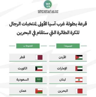 سحبت في العاصمة البحرينية المنامة، قرعة بطولة غرب آسيا الاولى للمنتخبات في الكرة الطائرة للرجال التي يشارك فيها منتخب لبنان، وتقام بين 17 و27 تموز الجاري بمشاركة 8 دول هي: السعودية والكويت وقطر والإمارات والاردن وسلطنة عمان ولبنان والبحرين، واوقعت القرعة منتخب لبنان في مجموعة سهلة نسبيًا مع منتخبات الإمارات والادرن والبحرين.