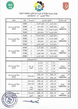 أذاعت اللجنة المنظمة لبطولة غرب آسيا الاولى في الكرة الطائرة لمنتخبات الرجال التي تستضيفها البحرين من 19 إلى 27 تموز الجاري في صالة عيسى بن راشد في الرفاع، والتي يشارك فيها منتخب لبنان، البرنامج الكامل لمباريات البطولة التي تستمر اسبوعًا.
