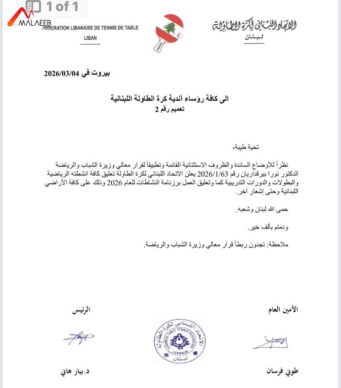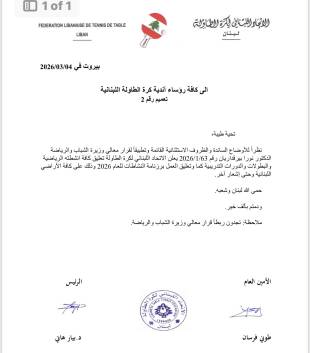 نظرًا للأوضاع السائدة والظروف الاستثنائية القائمة وتطبيقًا لقرار معالي وزيرة الشباب والرياضة الدكتورة نورا بيرقداريان رقم 63-1-2026، يعلن الاتحاد اللبناني لكرة الطاولة تعليق كافة انشطته الرياضية والبطوالت والدورات التدريبية كما وتعليق العمل بروزنامة النشاطات للعام 2026 وذلك على كافة الاراضي اللبنانية حتى إشعار آخر.