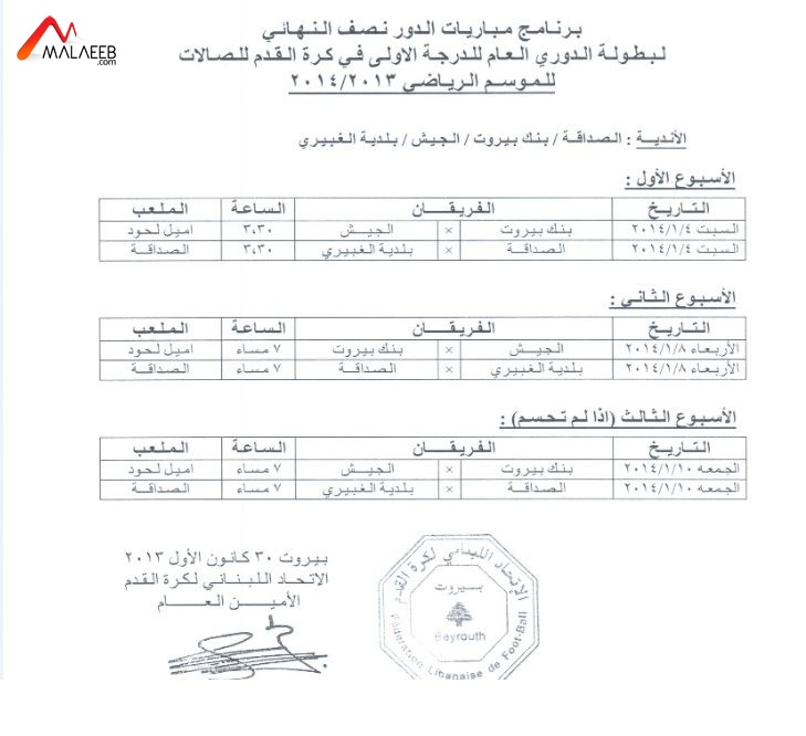 ينطلق دور "الفاينال فور" في الدوري اللبناني لكرة القدم للصالات السبت 4 كانون الثاني 2014 بمباراتين تقامان الساعة 15.30، الاولى تجمع بين بنك بيروت والجيش اللبناني على ملعب مجمع الرئيس العماد اميل لحود الرياضي، والثانية بين الصداقة وبلدية الغبيري على ملعب الاول.