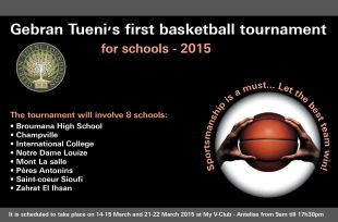 تنظم مؤسسة جبران تويني دورتها المدرسية السنوية الاولى في كرة السلة لفئة الذكور على "كأس جبران تويني"، ايام السبت والاحد 14 و15 و21 و22 آذار الجاري، على ملاعب "في كلوب" (V Club) في انطلياس، برعاية الاتحاد اللبناني لكرة السلة، ومشاركة مدارس الشانفيل ديك المحدي وزهرة الاحسان وسيدة اللويزة وبرمانا هاي سكول ومون لاسال والقلبين الاقدسين السيوفي وانترناشونال كولدج والمعهد الأنطوني.