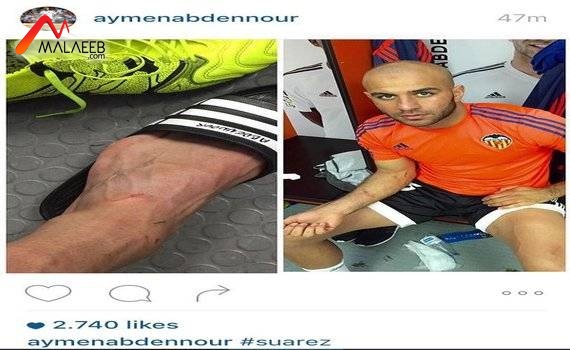 قام مدافع فريق فالنسيا التونسي أيمن عبد النور بنشر صورة عبر حسابه الرسمي على شبكة التواصل الاجتماعي (انستغرام) تظهر آثار اعتداء مهاجم برشلونة الاوروغوياني لويس سواريز عليه، في المباراة التي جمعت بينهما وانتهت بالتعادل الايجابي 1-1 في الجولة 14 من الدوري الاسباني.