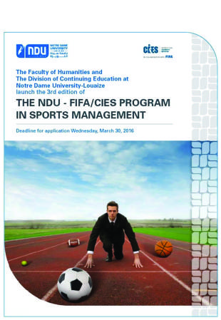 ويخوّل البرنامج الأكاديمي المعتمد في 17 جامعة حول العالم، الذي تدرّسه جامعة سيدة اللويزة كل يوم سبت على مدى موسم كامل وتنطلق سنته الثالثة في 9 نيسان وتستمر حتى 17 كانون الأول، الحصول على شهادة من الـFIFA/CIES. علماً أن برامج المركز الدولي لدراسات الرياضة، تؤهّل لحيازة درجة الجدارة "الماستر" FIFA MASTERفي الإدارة الرياضية وتُمنح في جامعات: "دي مونت فورت" في ليسيستر (إنكلترا)، "نوشاتيل" (سويسرا)، و"أس دي أ بوكوني" في ميلانو (إيطاليا).