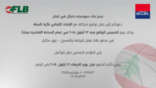 دعا الاتحاد اللبناني لكرة السلة وبنك "سوسييته جنرال" رجال الصحافة والاعلام الى حضور حفل توقيع الشراكة بينهما وذلك عند الساعة 10.00 من قبل ظهر الخميس الواقع فيه 13 أيلول الجاري في مجمّع "نهاد نوفل للرياضة والمسرح" في ذوق مكايل.