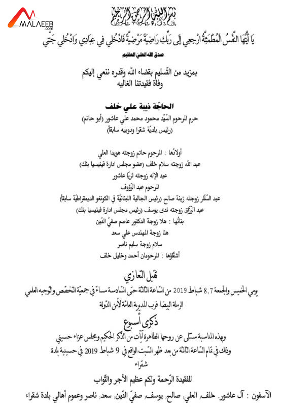يتقبل رئيس الاتحاد اللبناني لكرة اليد نائب رئيس الاتحاد الآسيوي للعبة عبدالله عاشور وعائلته التعازي بوفاة والدته ذيبة علي خلف، أرملة المرحوم محمود عاشور، يومي الخميس والجمعة 7 و8 شباط الجاري من الساعة الثالثة بعد الظهر حتى السادسة مساءً في جمعية التخصص والتوجيه العلمي – الرملة البيضا.