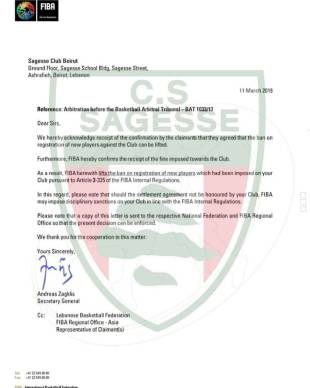 كما اكد امين سر النادي المحامي كميل سعادة في مداخلة عبر إذاعة "صوت الغد" رفع الحظر عبر رسالة تلقاها النادي من الاتحاد الدولي "فيبا" عبر الاتحاد اللبناني للعبة.