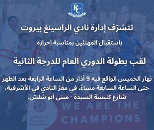 تستقبل اللجنة الادارية لنادي الراسينغ(بيروت) المهنئين لمناسبة احراز النادي البيروتي العريق لقب بطولة لبنان للدرجة الثانية في كرة القدم وتأهله الى مصاف اندية الدرجة الاولى وذلك بين الساعة 16.00 بعد الظهر وحتى الساعة 19.00 من مساء الخميس 9 آذار الجاري في مقر النادي الكائن في الأشرفية شارع السيدة- مبنى ابو شلش.