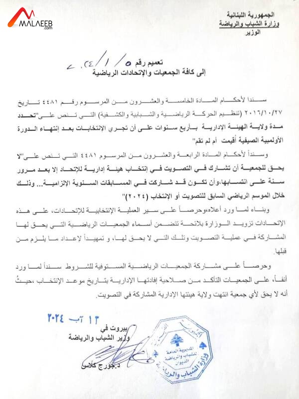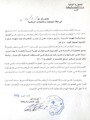 أصدر وزير الشباب والرياضة في حكومة تصريف الاعمال جورج كلّاس التعميم رقم 5/1/2024 تاريخ 13 آب 2024 الموّجه الى الجمعيات والإتحادات الرياضية كافة، وجاء فيه: