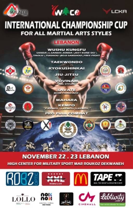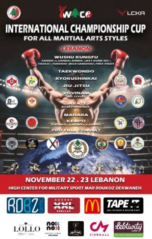 ينظم الاتحاد اللبناني للووشو كونغ فو، نهائيات البطولة الدولية لجميع الفنون القتالية لمناسبة عيد الاستقلال، والتي ستقام برعاية وزيرة الشباب والرياضة الدكتورة نورا بايراقدريان وقائد الجيش العماد رودولف هيكل، تحت إشراف وحضور رئيس وأعضاء الاتحاد اللبناني للووشو كونغ فو، بمشاركة كل الأساليب من اتحادات الفنون القتالية المعترف بها دوليًأ، وذلك يومي السبت والاحد 22 و23 تشرين الثاني الجاري في قاعة المركز العالي للرياضة العسكرية في مار روكز – الدكوانة.