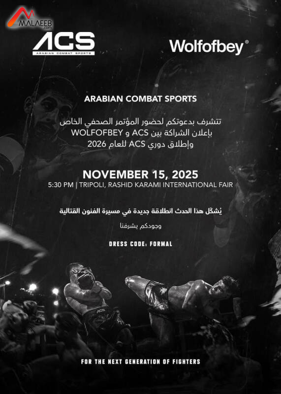 يُوقّع رئيس منظمة "أرابيان كومبات سبورتس"(ACS) وليد عجاج ورئيس مجلس ادارة "وولف أوف باي" Wolfofbey   جاد فاكهاني اتفاقية شراكة خلال مؤتمر صحافي يُعقد عند الساعة 17.30من مساء السبت 15 تشرين الثاني الجاري في "معرض رشيد كرامي الدولي" في مدينة طرابلس بحضور فاعليات رسمية، عسكرية، بلدية، اقتصادية، رياضية، اداريين، مدربين، لاعبين ورجال الصحافة والاعلام.