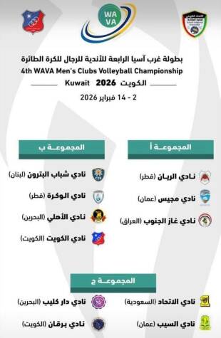 سحبت في الكويت العاصمة قرعة بطولة نوادي غرب آسيا الرابعة في الكرة الطائرة للرجال، التي تقام من 2 إلى 14 شباط المقبل في صالة الاتحاد الكويتي للعبة، ويشارك فيها نادي الشباب البترون (بطل لبنان).