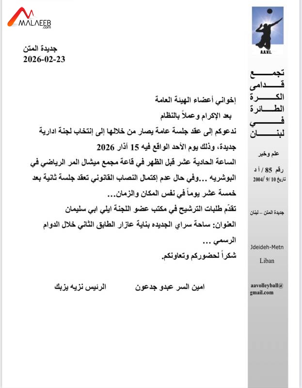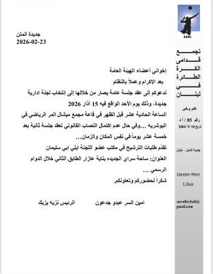 عملًا بنظام تجمع قدامى الكرة الطائرة في لبنان، دعا رئيس التجمع نزيه يزبك والامين العام عبدو جدعون إلى عقد جلسة عامة لاعضاء التجمع، يصار في خلالها إلى انتخاب لجنة إدارية جديدة، وذلك عند الساعة 11.00 من قبل ظهر الاحد 15 اذار المقبل، في قاعة مجمع ميشال المر الرياضي.