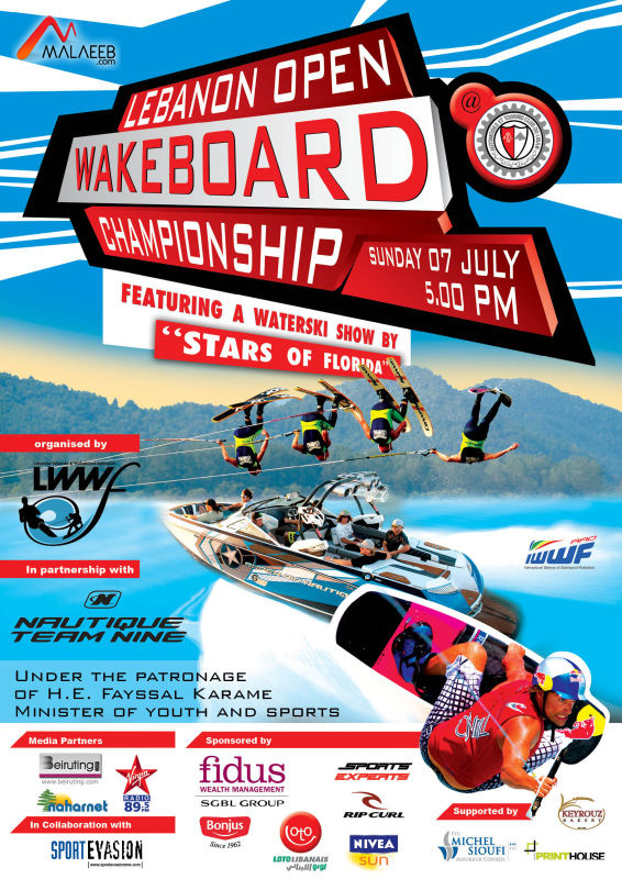 تنظّم لجنة التزلّج المائي بطولة لبنان المفتوحة في الألواح المائية (wakeboard) بالتعاون مع النادي اللبناني للسيارات والسياحة و"سبور ايفازيون" في خليج جونيه قبالة النادي الأحد المقبل الواقع في 7 تموز الجاري برعاية وزير الشباب والرياضة فيصل كرامي.