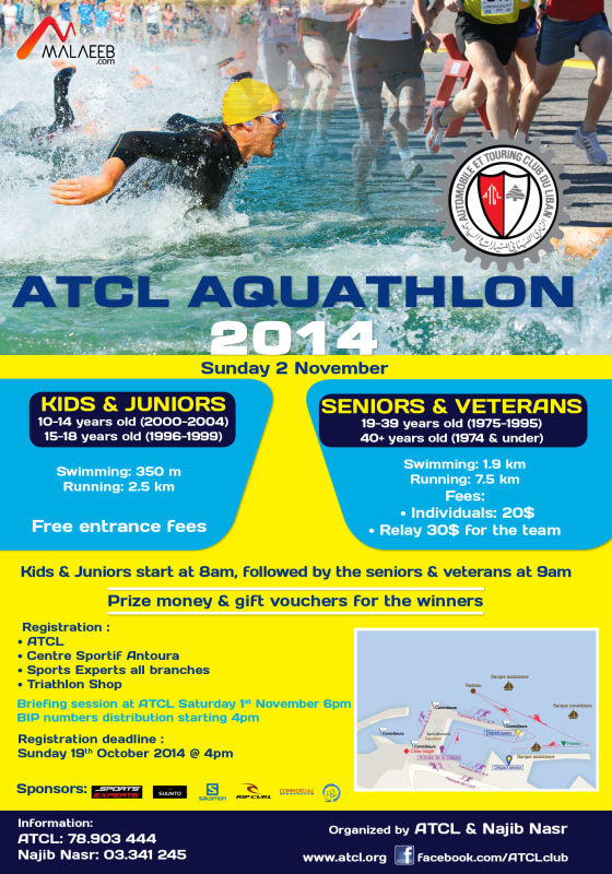 أنجز النادي اللبناني للسيارات والسياحة تحضيراته  لاقامة  مسابقة أكواتلون الأحد الواقع في 2 تشرين الثاني الجاري  في مقرّه في الكسليك برعاية "سبور اكسبير" و"كومرشال انشورنس" و"اكس اكس ال   اينيرجي درينك" .وستنطلق المسابقة عند الساعة الثامنة صباحاً على ان يقام حفل التتويج فور انتهاء جميع السباقات وفي حوالي الساعة العاشرة صباحاً  .وتضم المسابقة سباحة وركض  في سباق مفتوح امام اربع فئات عمرية للاناث والذكور وهي :فئة 10-14 سنة،فئة 15-18سنة،فئة 19-39 سنة وفئة 40 سنة وما فوق.وخُصّصت جوائز مالية وعينية للفائزين والفائزات .هذا ، وسيعقد اجتماع للمنظمين مع المشاركين في السباق عند الساعة السادسة من مساء السبت 1 تشرين الثاني في مقر النادي المنظّم في الكسليك.