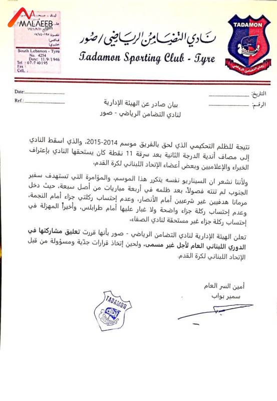 "نتيجة للظلم التحكيمي الذي لحق بالفريق في الموسم 2014-2015، والذي اسقط النادي الى مصاف اندية الدرجة الثانية بعد سرقة 11 نقطة كان يستحقها الفريق باعتراف الخبراء والإعلاميين وبعض أعضاء الاتحاد، ولاننا نشعر ان السيناريو يتكرر هذا الموسم، والمؤامرة التي تستهدف "سفير الجنوب" لم تنته فصولاً، بعد ظلمه في 4 مباريات من اصل 7، حيث دخل مرمانا هدفين غير شرعيين أمام الأنصار، فضلاً عن عدم احتساب ركلتي جزاء أمام النجمة، وعدم احتساب ركلة جزاء واضحة ولا غبار عليها أمام طرابلس، وأخيراً المهزلة في احتساب ركلة جزاء غير مستحقة لنادي الصفاء، تعلن الهيئة الإدارية لنادي التضامن الرياضي – صور تعليق مشاركتها في الدوري اللبناني العام لاجل غير مسمى، ولحين اتخاذ قرارات جدية ومسؤولة من قبل الاتحاد اللبناني لكرة القدم".