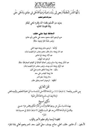 أما ذكرى الأسبوع، فتقام في حسينية بلدة شقرا عند الساعة الثالثة من بعد ظهر السبت 9 شباط الجاري.