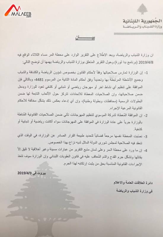 "ان وزارة الشباب والرياضة ، وبعد الاطلاع على التقرير الوارد على محطة المر مساء الثلاثاء الواقع فيه 2019 / 4 / 8 (برنامج بدا ثورة) وحول التقرير المتعلق بوزارة الشباب والرياضة يهمها أن توضح التالي: