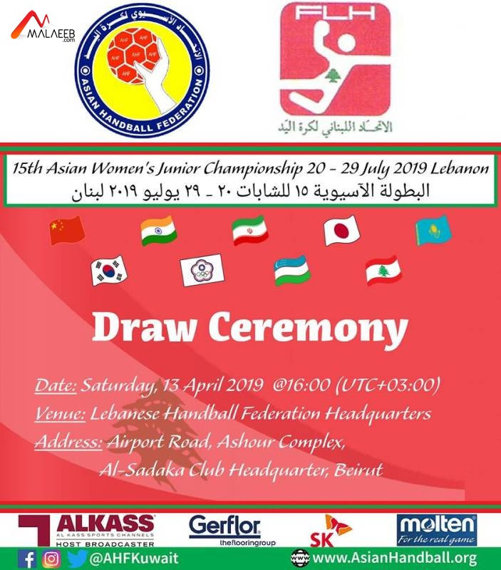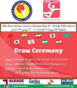 تُسحب قرعة البطولة الآسيوية الـ15 للشابات في كرة اليد عند الساعة 16:00 من بعد ظهر السبت 13 نيسان الجاري، في مقر الاتحاد اللبناني للعبة في قاعة حاتم عاشور لنادي الصداقة على طريق المطار.