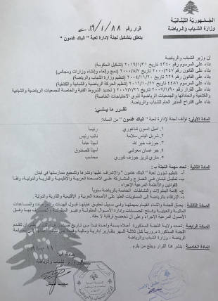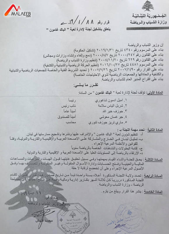اصدر وزير الشباب والرياضة محمد فنيش قراراً بتاريخ 11 حزيران الجاري يتعلق بتشكيل لجنة لادارة لعبة "الباك غامون" مؤلفة من:اميل ادمون شاغوري (رئيساً) وشربل الياس سلامة (نائباً للرئيس) وجوزيف خيرالله (اميناً عاماً) وجو غسان معوشي (أميناً للصندوق) وماري تيريز جوزيف تنوري (محاسبة).