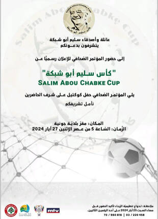 دعت عائلة وأصدقاء العضو السابق للجنة العليا للاتحاد اللبناني لكرة القدم والرئيس السابق لنادي الأهلي صربا الراحل سليم ابو شبكة رجال الصحافة والاعلام الى حضور المؤتمر الصحافي للاعلان رسمياً عن "كأس سليم ابو شبكة" في كرة القدم في مباراة ودية ستجمع منتخب لبنان (تحت 23 سنة) ونجوم الأندية اللبنانية تحت اشراف الاتحاد اللبناني لكرة القدم في 1 حزيران المقبل على ملعب مجمّع الرئيس فؤاد شهاب في جونية في الذكرى السنوية الأولى لرحيله.