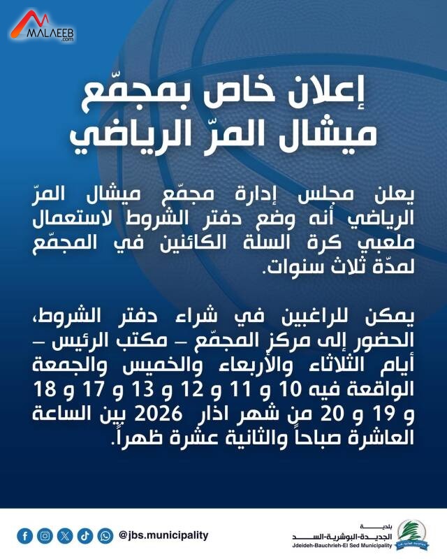 أعلن مجلس إدارة مجمع ميشال المر الرياضي، انه وضع دفتر الشروط لإستعمال ملعبي كرة السلة الكائنين في المجمع لمدة ثلاث سنوات.