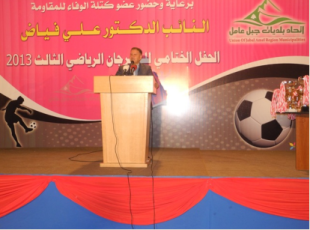 بعدها القى راعي الحفل النائب الدكتور علي فياض كلمة شكر فيها الاتحاد على هذه المبادرات والعمل المنظم والدؤوب الذي يساهم في ابعاد الشباب عن الآفات الخطرة ويوفر امامهم سبل التألق وابراز المواهب، مشيرا الى ان مثل هذه النشاطات هي وجه مشرق في تاريخ هذه المنطقة وتؤكد أن شبابنا يحبون الحياة ويعملون على التقدم.